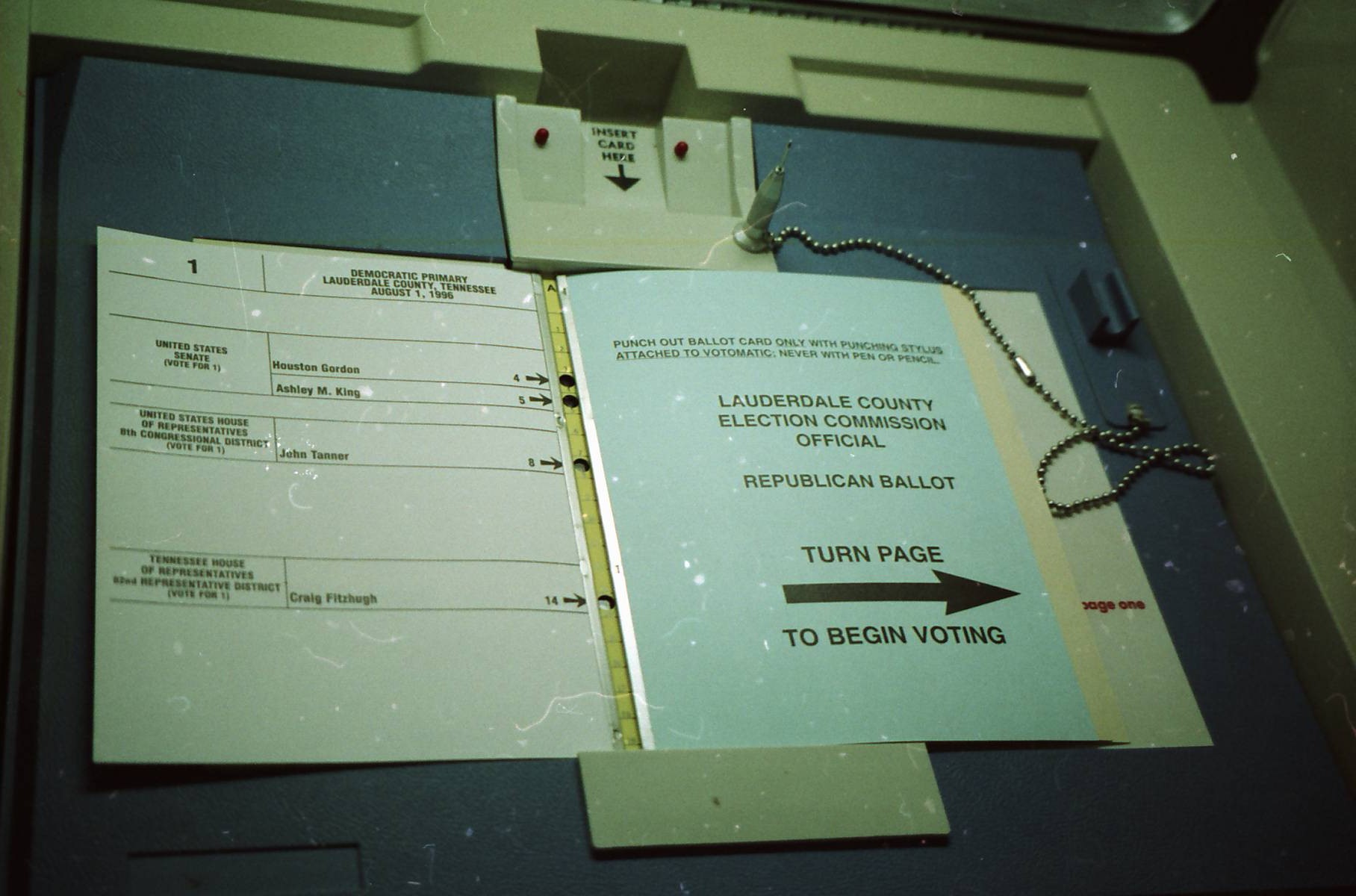 P.S. Pozele sunt din campania electorală din 1996 și sunt făcute de subsemnatul în Ripley, Tennessee. In poza este cabina de vot, buletinele care se marcheaza prin intepare cu un creion special. Cel care executa votul este un om care si-a dedicat anii celei de-a doua tinerete sprijinid programul international de la National Defense University din Washington D.C. si caruia ii multumim pentru sprijinul acordat de-a lungul anului 1996-1997. Cu tot respectul domnule Herman Reviere!
