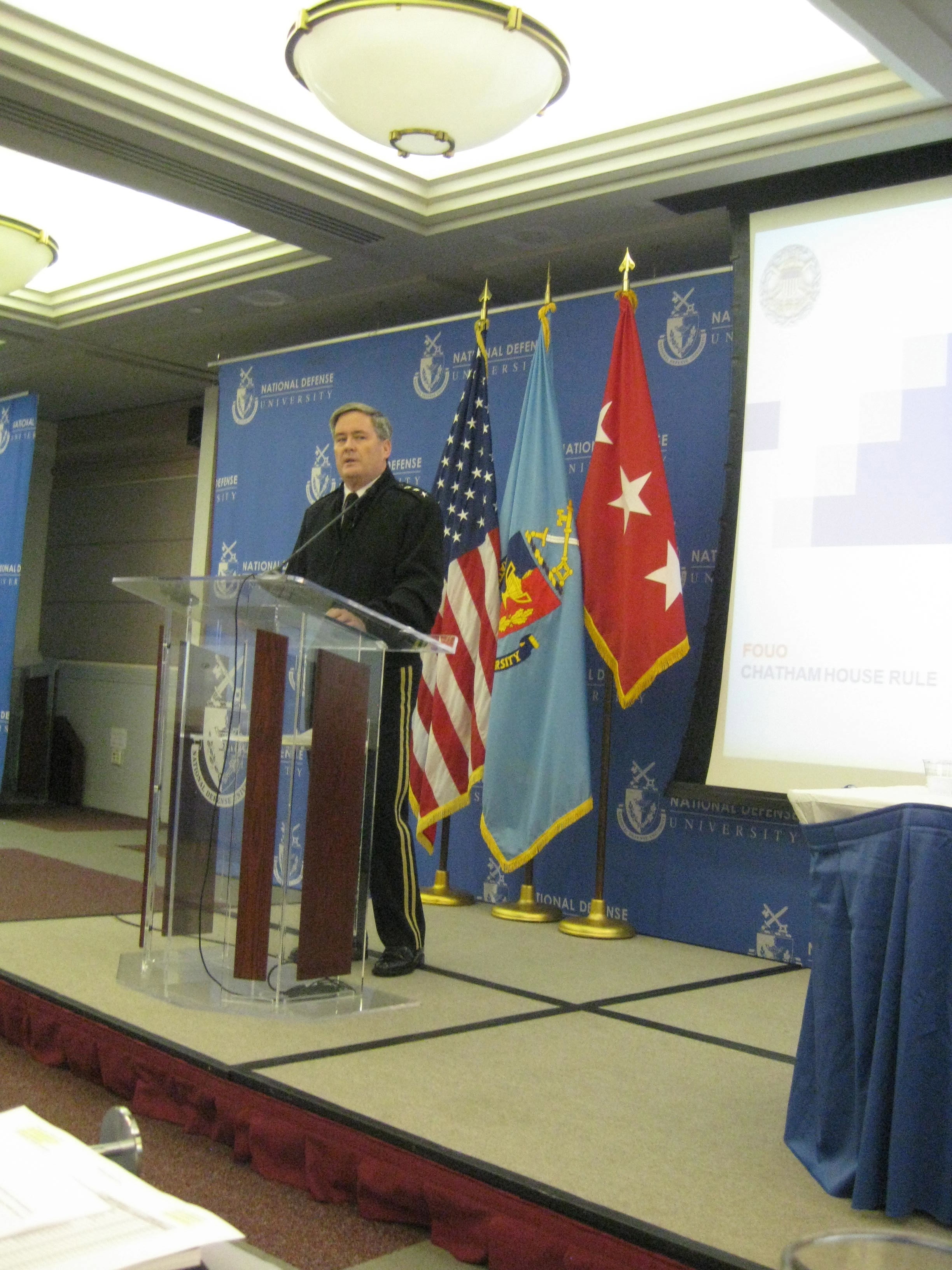 La fiecare 4 ani Universitatea Națională de Apărare a SUA (NDU) organizează un seminar pentru absolvenți. Din 1985 NDU a pregătit lideri militari pentru 100 de țări din întreaga lume. Sub conducerea Președintelului Comitetului Întrunit al Șefilor de State Majore absolvenții se reunesc la Washington pentru a discuta noile abordări strategice ce confrută sistemul militar și politic internațional. Strategii Pentagonului prezită absolvenților situația la zi a politicilor militare americane. Universitatea pregătește, în fapt, elita militară și politică a Americii. Cursanții obțin la absolvire Masterul în Strategia Resurselor pentru Apărare, dacă au urmat Colegiului Industrial al Forțelor Armate (ICAF) redenumit acum Dwight D. Eisenhower School for National Security and Resourse Strategy (ES). În calitatea de absolvent la ICAF am fost invitat să particip la lucrările seminarului organizat la Washington. O simplă privire aruncată pe pozițiile curente ale celor care au absolvit universitatea în ultimii ani ne devoalează: 10 poziții de șefi ai apărării, 16 poziții de șefi ai categoriilor de forțe armate la care se adaugă 26 de poziții de șefi de categorii de forțe armate care au fost deținute de foști absolvenți, 4 poziții de comnadați în misiunile ONU sau ale UE plus alte multe poziții în zona politică și diplomatică a țărilor de origine. Este un panou impresionant cu lideri militari. Comandantul universității, generalul maior Gregg F Martin a fost anfitrionul nostru de această dată. Generalul Gregg ne-a primit cu următoarele cuvinte, rostite în deschiderea seminarului în aula universității: Puterea vine din mințile noastre nu numai din puterea armelor pe care le construim, avioane sau portavioane. Puterea vine din gândirea strategică și din pregătirea militară a liderilor noștrii. Noi suntem călătorii către viitor. Cele câteva zile petrecute la Washington au fost dense și pline de întâlniri și brifinguri. Temele abordate au făcut referire la relațiile militar-civil și controlul armamentelor în viziunea Departamentului de Stat, conceptul de Air-Sea Battle, Pivotul american în Asia și viitorul securității maritime în zona lărgită a Asia-Pacific, problemele de securitate din Orientul Mijlociu și Primăvara Arabă, securitatea Europeană și securitatea din America Latină, războiul cibernetic. De asemenea o surpriză pe care am avut-o a fost un brifing al amiralului William Harry Bill McRaven Comnadantul Comandamentului Forțelor Speciale americane, brifing care ne-a ținut cu respirația tăiată. Amiralul este cel care a organizat și condus echipa care l-a anihilat pe cel mai căutat terorist al planetei Osam bin-Laden. Este o onoare și o plăcere să-l asculți. Astăzi am să vorbesc depre prezentarea generalul locotenent Terry Wolff Directorul Directoratului de Politici și Planificare Strategică J5 (următorul material va fi dedicat exclusiv amiralului Willlian Harry McRaven). Ca să protejezi interesul global american, noi militarii americani, trebuie să traducem incertitudinea de astăzi în strategia de mâine – începea discursul generalul Terry Wolff directorul J5. Politicile strategice redactate de J5 sunt bazate pe îndeplinirea obiectivelor naționale prezente în Quadrennial Defense Review, documentul care cuprinde prioritățile, planurile și obiectivele pe următorii patru ani, pe realizarea programului Building Partenership Capacity și pe noua realitate a situației nucleare globală. De asemenea în mandatul directoratului J5 generalul Wolff a încadrat la probleme strategice cu prioritate maximă, protecția tuturor ambasadelor și consulatelor americane. Pe lângă cele de mai sus importanța Directoratului J5 este dată de pregătirea opțiunile necesare pentru deciziile președintelui american și a președintelui Comitetului Întrunit al Șefilor de State Majore. Generalul Wollf a vorbit de problemele globale în conjuncție cu trendurile globale. Astfel din categoria problemelor globale fac parte: atacurile cibernetice, scutul antirachetă, culegerea de informații supravegherea și monitorizarea – Intelligence Surveillance Reconnaissance, construirea de capacități pentru programul Building Partebership Capacity, operațiunile speciale, definirea palnurilor strategice și a celor politice, definirea planurilor de război. De asemenea schimburile de informații cu aliații și partenerii sunt considerate de general critice pentru Pentagon în combaterea actelor de terorism dar și a crimei organizate. Aici au fost menționate relațiile cu Europa și cele cu țările din Pacific dar și noile relații stabilite cu partenerii africani. În ordinea priorităților s-au situat apoi creșterea interoperabilității, folosirea de tactici, tehnici și proceduri comune cât și echipament și procese de planificare comune în operațiile de coaliție și în situațiile critice de-a lungul globului (Joint/Combined Exchange Training și Developing Country Combined Exercise Program). Pentru primul set de probleme am să mă opresc asupra conceptului de Building Partebership Capacity. Este vorba de programul prioritar care ajută partenerii SUA să-și construiască instituții de securitate legitime, a căror activitate efectivă să contribuie la stabilitatea internă dar și la cea regională și să asigure participarea în operațiunile multilaterale. Sarcina antrenării, consilierii și a operațiunilor în parteneriat este operațională în întreg sistemul categoriilor de forțe ale SUA ea mutându-se de la periferia activităților pe agenda de lucru la o poziție care-i conferă un rol strategic. Aici avem de-a face cu activități de antrenare și echipare a unităților de contraterorism, finanțarea a două teatre de acțiune împotriva al-Qaida și afiliaților în Yemen și Africa de Est dar și finanțarea prin fondul Global Security Contingency Fund aflat
